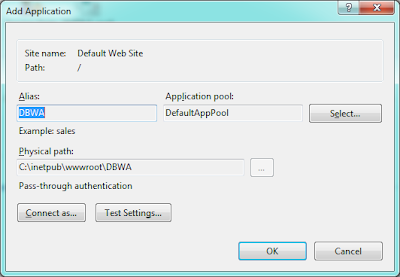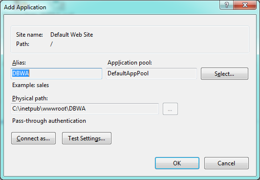 Expand the Default Web Site node, find the DBWA folder, right click and select "Convert to Application" then click the Ok button.
